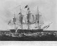 Photo #: NH 63180-KN (color) Action between USS Chesapeake and HMS Shannon, 1 June 1813 Colored lithograph by L. Haghe, after a painting by J.C. Schetky based on a design by Captain R.H. King, RN. Published by Smith, Elder & Company, London, in 1830. This print (Plate No. 4 of four) depicts Shannon "leading her prize ... into Halifax Harbour, on the 6th June 1813", with the Royal Navy's "White Ensign" flown above the United States Ensign on board Chesapeake See Photo # NH 63181 for a detailed description of the action and the activity seen in each of the four prints. The series is dedicated to Captain Philip Bowes Vere Broke, R.N., Shannon's Commanding Officer. Courtesy of the U.S. Naval Academy Museum, Annapolis, Maryland. Beverly R. Robinson Collection. U.S. Naval Historical Center Photograph. Online Image: 137KB; 740 x 635 pixels |