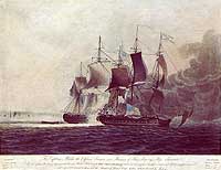 Photo #: NH 42906 Engagement between USS Chesapeake and HMS Shannon, 1 June 1813 Print painted, engraved and published by W. Elmes, London, August 1813. It depicts the capture of Chesapeake off Boston, Massachusetts, after a sharp engagement and boarding by Shannon's crew. Boston light house is shown in the left background. Courtesy of the U.S. Naval Academy Museum, Annapolis, Maryland. Beverly R. Robinson Collection, March 1937. U.S. Naval Historical Center Photograph. Online Image: 127KB; 740 x 615 pixels |