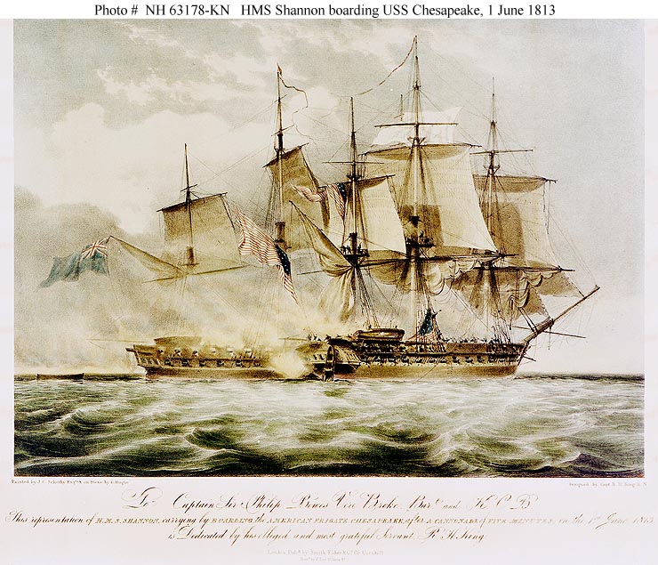 Photo #: NH 42907 Action between USS Chesapeake and HMS Shannon, 1 June 1813 Artwork depicting the two frigates exchanging gunfire early in the battle, which took place off Boston, Massachusetts. The text below the image is reproduced in Photo # NH 42907 (extended caption). Courtesy of Mr. Beverly R. Robinson, March 1937. U.S. Naval Historical Center Photograph. Online Image: 121KB; 740 x 600 pixels |