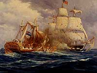 Photo #: NH 48472-KN (Color) Action between USS Constitution and HMS Guerriere, 19 August 1812 Painting by Anton Otto Fischer, depicting Guerriere's masts going over the side as Constitution rakes her from ahead. Courtesy Miss Katrina S. Fischer. U.S. Naval Historical Center Photograph. Online Image: 101KB; 740 x 585 pixels |