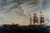 Photo #: K-26255 (Color) Action between USS Constitution and HMS Guerriere, 19 August 1812: "She Fell in the Sea a Perfect Wreck" Oil on canvas, 32" x 48", by Michel Felice Corne (1752-1845), depicting the dismasted Guerriere firing a gun to the unengaged side to signify her surrender. Painting in the collections of the U.S. Naval Academy Museum, transferred from the Navy Department in 1869. Official U.S. Navy Photograph. Online Image: 76KB; 740 x 510 pixels Reproductions of this image may also be available through the National Archives photographic reproduction system. |