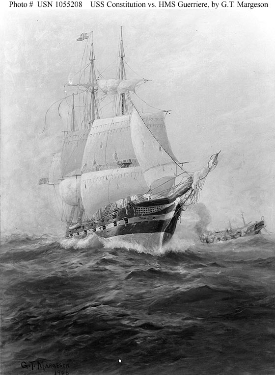 Photo #: KN-10953 (Color) Action between USS Constitution and HMS Guerriere, 19 August 1812 Oil on canvas, 46" x 64", attributed to Thomas Birch (1779-1851). It depicts Constitution standing off the dismasted British frigate's bow, as the latter strikes her flag in surrender. Painting in the collections of the U.S. Naval Academy Museum. Bequest of Mrs. Walter Jennings, 1949. Official U.S. Navy Photograph. Online Image: 103KB; 740 x 565 pixels Reproductions of this image may also be available through the National Archives photographic reproduction system as Photo # 428-KN-10953 |