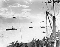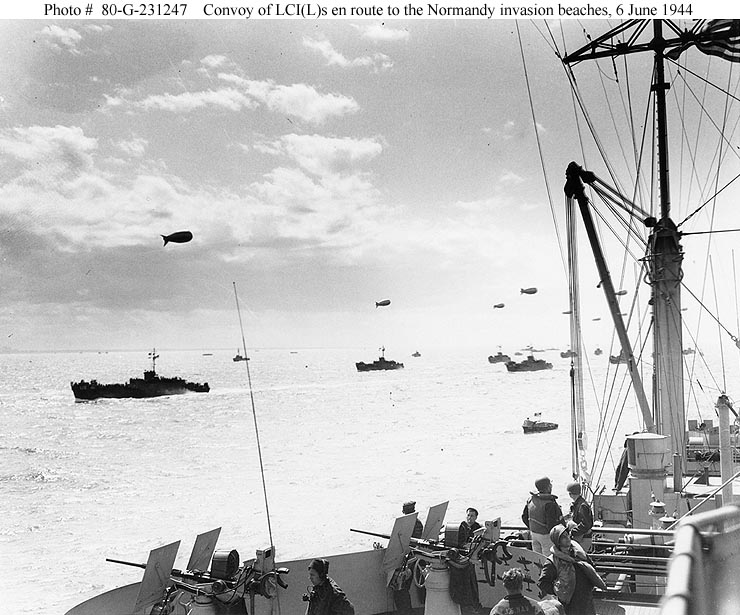 Photo #: 80-G-252499 Normandy Invasion, June 1944 A flotilla of LCI(L)s underway off the invasion beaches, with barrage balloons overhead, 6 June 1944. Official U.S. Navy Photograph, now in the collections of the National Archives. Online Image: 74KB; 740 x 610 pixels Reproductions of this image may also be available through the National Archives photographic reproduction system. |