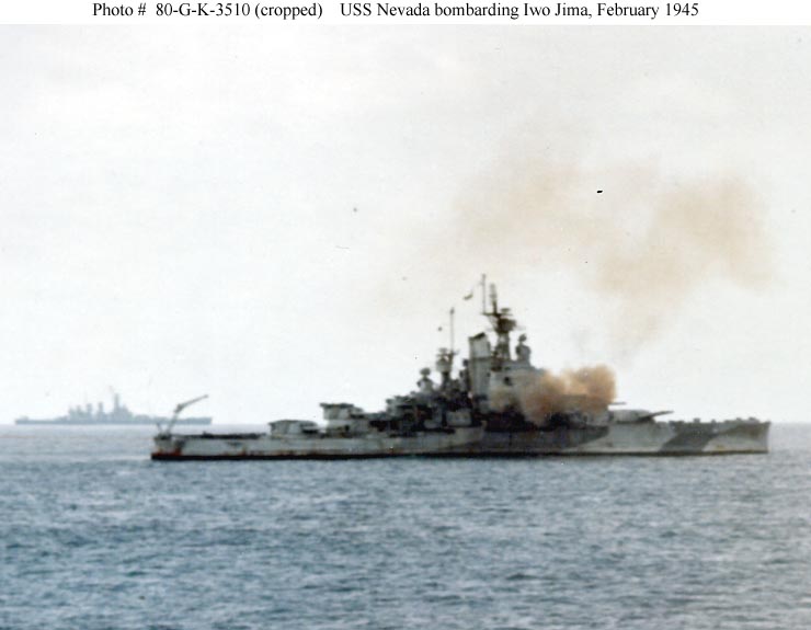 Photo #: 80-G-K-3510 (Color) Iwo Jima Operation, 1945 USS Nevada (BB-36) bombarding Iwo Jima, 19 February 1945. A North Carolina class battleship (probably USS Washington, BB-56) is in the left distance. Official U.S. Navy Photograph, now in the collections of the National Archives. Online Image: 59KB; 740 x 605 pixels Reproductions of this image may also be available through the National Archives photographic reproduction system. |