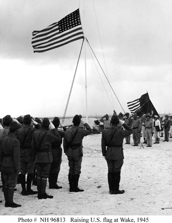 Photo #: NH 96813 Surrender of Wake Atoll, 4 September 1945 Raising the U.S. flag over Wake Island on 4 September 1945, as a U.S. Marine Corps bugler plays "Colors". This was the first time the Stars and Stripes had flown over Wake since its capture by the Japanese on 23 December 1941. The officer saluting in the right foreground is Rear Admiral Shigematsu Sakaibara, Japanese commander on Wake. Colors carried by the U.S. party, right background, include the U.S. Marine Corps flag. Photographed by R.O. Kepler, USMC. U.S. Marine Corps Photograph, in the Collections of the Naval Historical Center. Online Image: 70KB; 590 x 765 pixels |