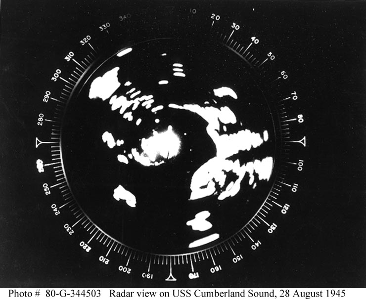Photo #: 80-G-344503 USS Cumberland Sound (AV-17) Remote PPI radar scope image, photographed as the seaplane tender entered Tokyo Bay with U.S. occupation forces, 28 August 1945. The scope is set at ten-mile scale. Official U.S. Navy Photograph, now in the collections of the National Archives. Online Image: 64KB; 740 x 605 pixels Reproductions of this image may also be available through the National Archives photographic reproduction system. |