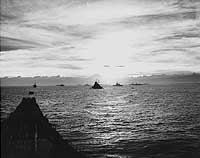 Photo #: 80-G-490414 Sagami Wan, Japan The sun sets behind Mount Fujiyama on 27 August 1945, as seen from USS Missouri anchored in Sagami Wan, outside of Tokyo Bay. Ships of the U.S. Third Fleet and the British Pacific Fleet are in the distance. Closest to the camera, in center, is HMS Duke of York, with HMS King George V next beyond her. Official U.S. Navy Photograph, now in the collections of the National Archives. Online Image: 72KB; 740 x 610 pixels Reproductions of this image may also be available through the National Archives photographic reproduction system. |