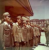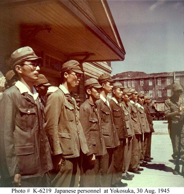 Photo #: 80-G-K-6219 (Color) Yokosuka Naval Base, Japan Japanese personnel stand in formation, during the surrender of the Yokosuka Naval base to U.S. Navy and Marine Corps forces, 30 August 1945. Photographed by Lieutenant Dewey Wrigley. Official U.S. Navy Photograph, now in the collections of the U.S. National Archives. Image Quality Note: The original 2 1/4" x 2 1/4" color transparency had become rather purple. This color shift has been somewhat corrected in this reproduction. Online Image: 93KB; 640 x 675 pixels Reproductions of this image may also be available through the National Archives photographic reproduction system. |