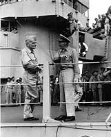 Photo #: 80-G-353633 Surrender of Japan, Tokyo Bay, 2 September 1945 Admiral William F. Halsey and Vice Admiral John S. McCain chatting by the rail on USS Missouri (BB-63), after the conclusion of of the surrender ceremonies, 2 September 1945. Official U.S. Navy Photograph, now in the collections of the National Archives. Online Image: 95KB; 620 x 615 pixels Reproductions of this image may also be available through the National Archives photographic reproduction system. |