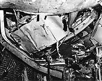 Photo #: NH 68356 USS Washington (BB-56) Damage received in her 1 February 1944 collision with USS Indiana (BB-58). View looks inboard through the opening in the hull forward of the starboard bow. U.S. Naval Historical Center Photograph. Online Image: 131KB; 740 x 615 pixels |