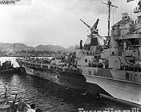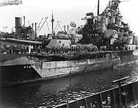 Photo #: NH 92880 USS Indiana (BB-58) At Pearl Harbor on 13 February 1944, showing damage to her starboard side received in her 1 February 1944 collision with USS Washington (BB-56). U.S. Naval Historical Center Photograph. Online Image: 102KB; 740 x 605 pixels |