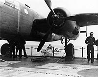 Crewmen work on a USAAF B-25B parked at the rear of USS Hornet's