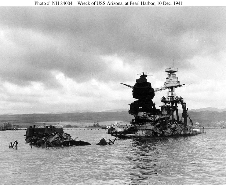 Photo #: NH 64473 USS Arizona (BB-39) Wrecked at Pearl Harbor, 12 December 1941. Her forward magazines had exploded, destroying the ship, when she was hit by bombs during the 7 December 1941 Japanese attack. By the date of this photo, the National Ensign was being flown from her mainmast, rather than at the stern. Official U.S. Navy Photograph, from the collections of the Naval History and Heritage Command. Online Image: 86KB; 740 x 605 pixels |