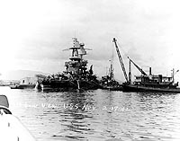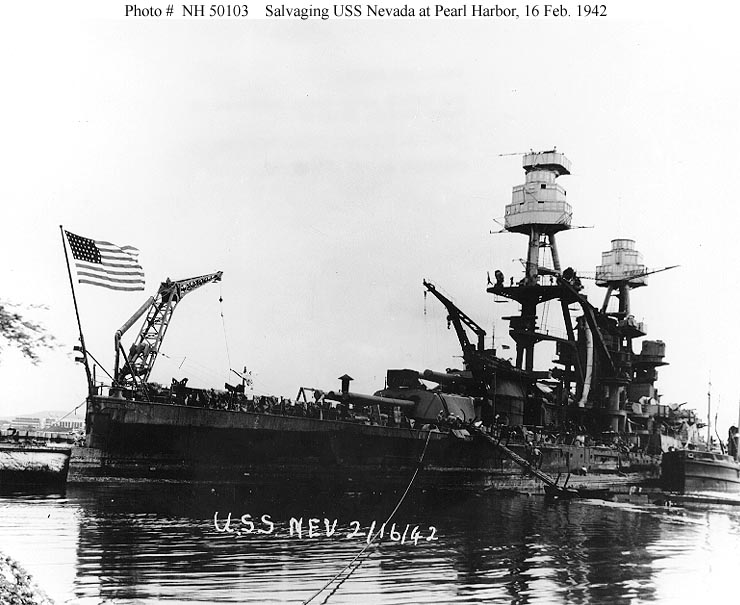 Photo #: NH 50103 Salvage of USS Nevada (BB-36), 1941-42 Nevada in Pearl Harbor on 16 February 1942, while she was being prepared for drydocking after she was refloated. She entered the Pearl Harbor Navy Yard's Drydock Number Two on 18 February. Collection of Vice Admiral Homer N. Wallin. Official U.S. Navy Photograph, from the collections of the Naval History and Heritage Command. Online Image: 79KB; 740 x 605 pixels |
