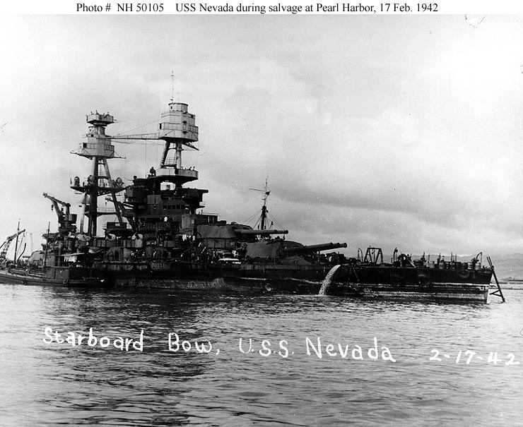 Photo #: NH 50105 Salvage of USS Nevada (BB-36), 1941-42 Nevada in Pearl Harbor on 17 February 1942, while she was being prepared for drydocking after she was refloated. She entered the Pearl Harbor Navy Yard's Drydock Number Two on the following day. Collection of Vice Admiral Homer N. Wallin. Official U.S. Navy Photograph, from the collections of the Naval History and Heritage Command. Online Image: 93KB; 740 x 605 pixels |