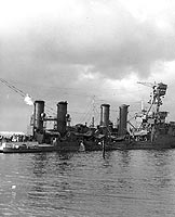 Photo #: 80-G-19938 Pearl Harbor Attack, 7 December 1941 USS Raleigh (CL-7) is kept afloat by a barge lashed alongside, after she was damaged by a Japanese torpedo and a bomb, 7 December 1941. The barge has salvage pontoons YSP-14 and YSP-13 on board. The capsized hull of USS Utah (AG-16) is visible astern of Raleigh. Official U.S. Navy Photograph, now in the collections of the National Archives. Online Image: 70KB; 740 x 605 pixels Reproductions of this image may also be available through the National Archives photographic reproduction system. |