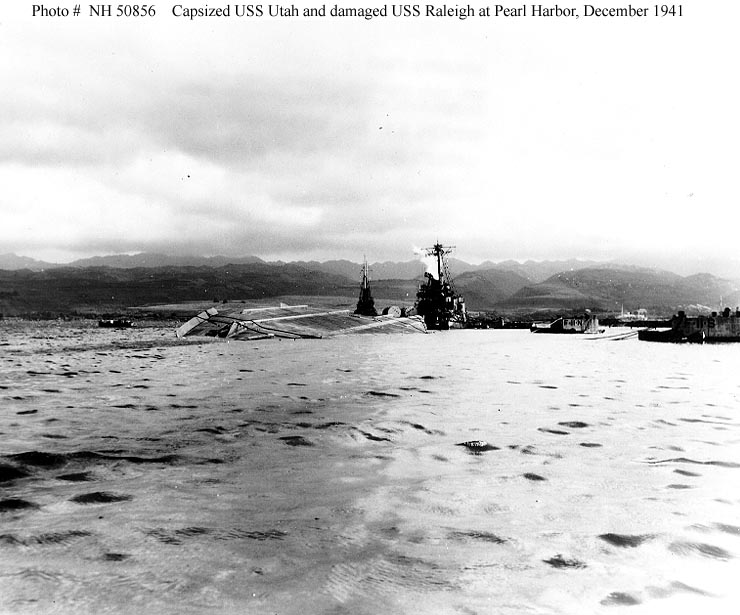 Photo #: NH 64498 Pearl Harbor Attack, 7 December 1941 Bow view of the capsized USS Utah (AG-16), as seen from the stern of USS Raleigh (CL-7) on 12 December 1941. Utah had been torpedoed and sunk during the Japanese attack five days earlier. U.S. Naval History and Heritage Command Photograph. Online Image: 93KB; 740 x 620 pixels |