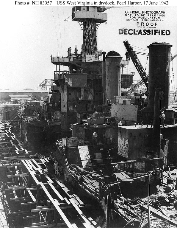 Photo #: NH 83057 USS West Virginia (BB-48) In Drydock Number One at the Pearl Harbor Navy Yard, 17 June 1942. She was receiving repairs for the massive damage she received in the 7 December 1941 Japanese attack. Note that her hull side and upper deck amidships has been cut away. Collection of Vice Admiral Homer N. Wallin, USN (Retired). U.S. Naval History and Heritage Command Photograph. Online Image: 131KB; 595 x 765 pixels |