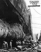 Photo #: NH 64488 Salvage of USS West Virginia (BB-48), 1942-43 West Virginia in Drydock Number One at Pearl Harbor Navy Yard, 11 June 1942. View looks aft along her port side from about Frame 64, showing distortion of the armor belt and damaged hull structure above and below. Several Japanese Type 91 torpedoes had detonated in this area during the 7 December 1941 air raid. Official U.S. Navy Photograph, from the collections of the Naval History and Heritage Command. Online Image: 145KB; 610 x 725 pixels |
