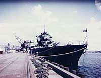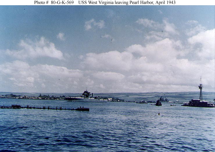 Photo #: 80-G-K-569 (Color) USS West Virginia (BB-48) Leaving Pearl Harbor on 30 April 1943, en route to the Puget Sound Navy Yard, Bremerton, Washington, for reconstruction. The Pearl Harbor Navy Yard had just finished temporary repair of the damage she had received in the Japanese attack of 7 December 1941. A New Mexico class battleship is in the right distance, and at far right is the former mainmast of USS California (BB-44), now serving as a signal tower ashore. Official U.S. Navy Photograph, now in the collections of the National Archives. Online Image: 78KB; 740 x 525 pixels Reproductions of this image may also be available through the National Archives photographic reproduction system. |