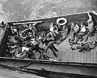 Photo #: 26-G-2368 Normandy Invasion, June 1944 LCM landing craft, evacuating casualties from the invasion beaches, brings them to a transport for treatment, on "D-Day", 6 June 1944. See Photo # 26-G-2386 for another view of this LCM. Photograph from the U.S. Coast Guard Collection in the U.S. National Archives. Online Image: 157KB; 740 x 625 pixels Reproductions of this image may also be available through the National Archives photographic reproduction system. |