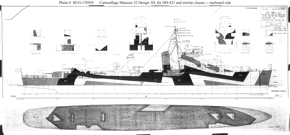 Photo #: 80-G-170950 Camouflage Measure 32, Design 3D Drawing prepared by the Bureau of Ships for a camouflage scheme intended for destroyers of the DD-421 (Benson) class. It could also be adapted to the DD-348 (Farragut), DD-356 (Porter), DD-364 (Mahan), DD-384 (Dunlap) and DD-423 (Gleaves) classes. This plan, approved by Captain Logan McKee, USN, is dated 18 March 1944. It shows the ship's starboard side, superstructure ends and exposed decks. Official U.S. Navy Photograph, now in the collections of the National Archives. Online Image: 150KB; 1200 x 560 pixels Reproductions of this image may also be available through the National Archives photographic reproduction system. |