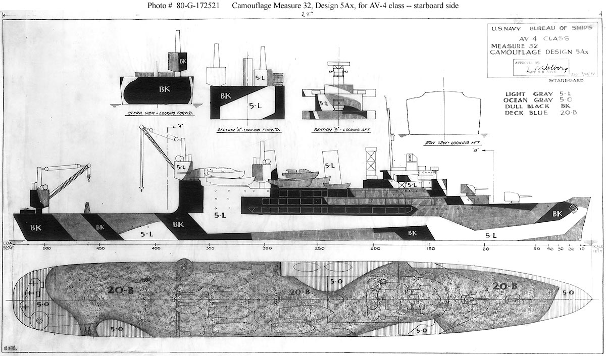 Photo #: 80-G-172521 Camouflage Measure 32, Design 5Ax Drawing prepared by the Bureau of Ships for a camouflage scheme intended for seaplane tenders of the AV-4 (Curtiss) class. This plan, approved by Captain Torvald A. Solberg, USN, is dated 18 March 1944. It shows the ship's starboard side, stern, superstructure ends and exposed decks. Official U.S. Navy Photograph, now in the collections of the National Archives. Online Image: 178KB; 1200 x 705 pixels Reproductions of this image may also be available through the National Archives photographic reproduction system. |