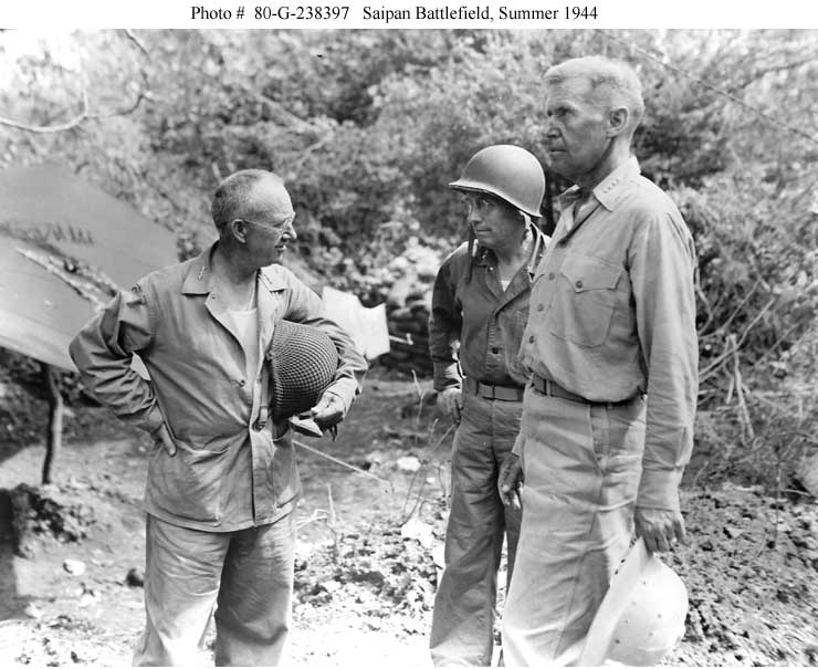Photo #: 80-G-238397 Saipan Battlefield Conference, summer 1944 Lieutenant General Holland M. Smith, USMC, Commander Fifth Amphibious Corps; Major General Thomas E. Watson, USMC, Commanding General, Second Marine Division; and Admiral Raymond A. Spruance, USN, Commander, Fifth Fleet, (listed from left to right) discuss the Saipan tactical situation at the Divisional Headquarters Tentn on the Saipan battlefield. This photograph was received by the Navy Photo Science Laboratory on 13 July 1944. Official U.S. Navy Photograph, now in the collections of the National Archives. Online Image: 85KB; 740 x 605 pixels Reproductions of this image may also be available through the National Archives photographic reproduction system. |