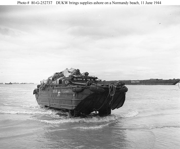 Photo #: 80-G-252737 Normandy Invasion, June 1944 A U.S. Army DUKW amphibious truck (nicknamed "Jesse James") brings supplies ashore on a Normandy beach, 11 June 1944. Taken by Combat Photo Unit Eight (CPU-8). Official U.S. Navy Photograph, now in the collections of the National Archives. Online Image: 68KB; 740 x 610 pixels Reproductions of this image may also be available through the National Archives photographic reproduction system. |