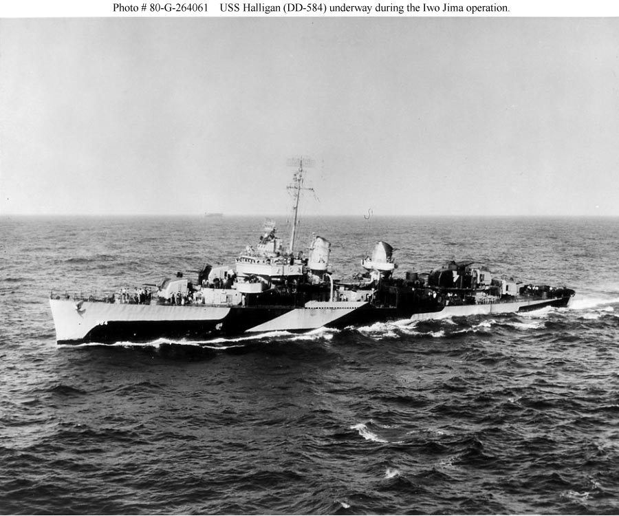 Photo #: 80-G-264061 USS Halligan (DD-584) Pulling away after delivering mail to USS Sargent Bay (CVE-83) on 1 March 1945, during the Iwo Jima Operation. Photographer: PH3 John M. Andrews. Halligan is painted in Camouflage Measure 32, Design 1D. For drawings of this design, see Photo # 80-G-158589 (starboard side) and Photo # 80-G-158590 (port side). Official U.S. Navy Photograph, now in the collections of the National Archives. Online Image: 114 KB; 900 x 750 pixels Reproductions of this image may also be available through the National Archives photographic reproduction system. |