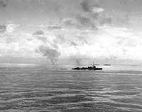 Photo #: 80-G-34683 Guadalcanal - Tulagi Operation, August 1942 USS Hopkins (DMS-13) steams past the transport area between Guadalcanal and Tulagi, 8 August 1942. Ship burning in the left center distance is USS George F. Elliott (AP-13), which had been hit by a Japanese air attack earlier in the day. Official U.S. Navy Photograph, now in the collections of the National Archives. Online Image: 92KB; 740 x 610 pixels Reproductions of this image may also be available through the National Archives photographic reproduction system. |
