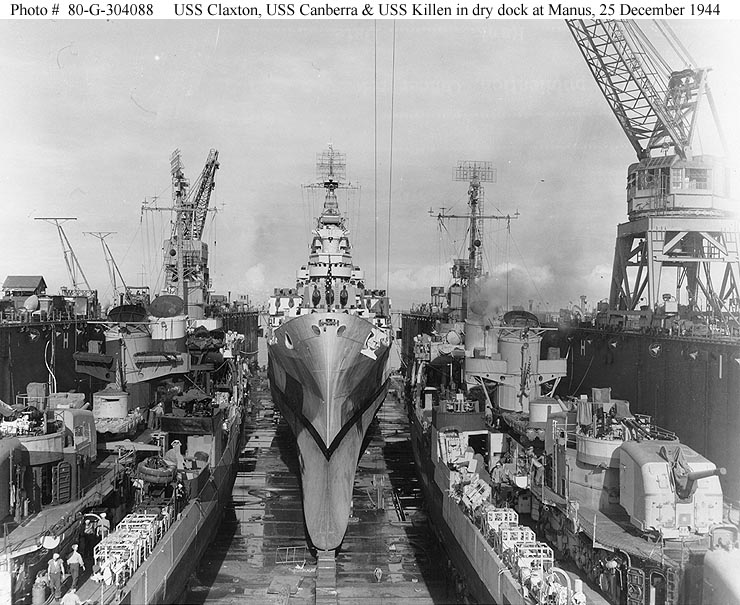 Photo #: 80-G-304088 USS Claxton (DD-571), at left, USS Canberra (CA-70), center, and USS Killen (DD-593), right Undergoing battle damage repairs in the floating drydock ABSD-2 at Manus, Admiralty Islands, 2 December 1944. Official U.S. Navy Photograph, now in the collections of the National Archives. Online Image: 126KB; 740 x 605 pixels Reproductions of this image may also be available through the National Archives photographic reproduction system. |