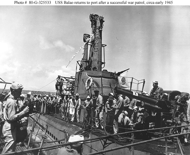 Photo #: 80-G-325533 USS Balao (SS-285) Returns to port after a successful war patrol, circa early 1945. The location is probably Guam. Note her 5"/25 deck gun at right, battle flag hung from her forward 20mm gun, blindfolded Japanese prisoners of war being escorted along her deck, and photographer at left. Official U.S. Navy Photograph, now in the collections of the National Archives. Online Image: 105KB; 740 x 605 pixels Reproductions of this image may also be available through the National Archives photographic reproduction system. |