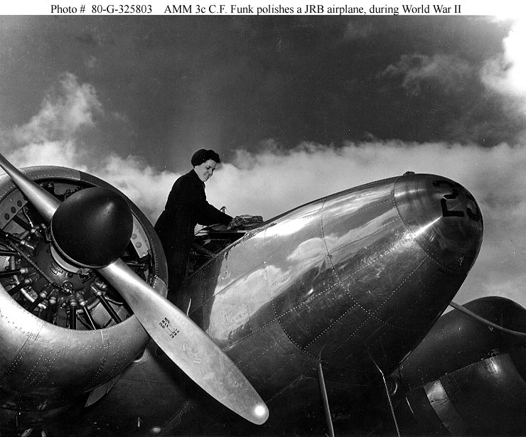 Photo #: 80-G-325803 Aviation Machinist's Mate 3rd Class C.F. Funk, USNR(W) Polishes a SNB or JRB airplane, during World War II. Engine is a Pratt & Whitney R-985 radial. Note propeller markings Official U.S. Navy Photograph, now in the collections of the National Archives. Online Image: 91KB; 740 x 615 pixels Reproductions of this image may also be available through the National Archives photographic reproduction system. |