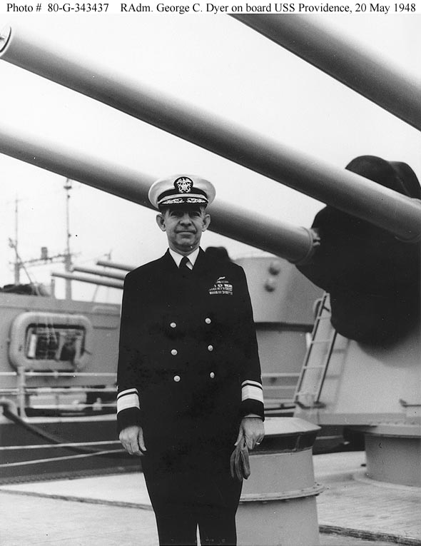 Photo #: 80-G-343437 Rear Admiral George C. Dyer, USN, Commander Cruiser Division Ten On board his flagship, USS Providence (CL-82), 20 May 1948. Note 6"/47 guns behind him. Official U.S. Navy Photograph, now in the collections of the National Archives. Online Image: 60KB; 590 x 765 pixels Reproductions of this image may also be available through the National Archives photographic reproduction system. |