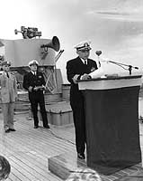 Photo #: 80-G-414591 USS Missouri (BB-63) Captain Irving T. Duke reads his orders during change of command ceremonies on the battleship's after deck, at Norfolk Naval Station, Virginia, 19 April 1950. He relieved Captain Harold P. Smith (2nd from left, in background) as Missouri's Commanding Officer. Captain Roland Smoot is at left. Official U.S. Navy Photograph, now in the collections of the U.S. National Archives. Online Image: 77KB; 590 x 765 pixels Reproductions of this image may also be available through the National Archives photographic reproduction system. |