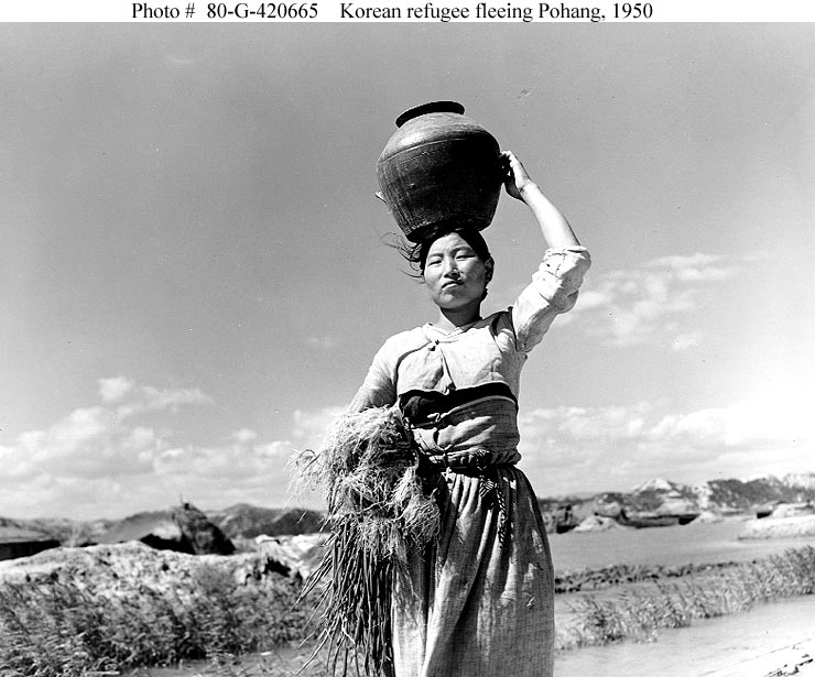 Photo #: 80-G-420665 Korean refugee woman Carries her belongings in a jug on her head, while fleeing from Pohang, South Korea. Original photo is dated 17 October 1950. Official U.S. Navy Photograph, now in the collections of the National Archives. Online Image: 87KB; 740 x 615 pixels Reproductions of this image may also be available through the National Archives photographic reproduction system. |