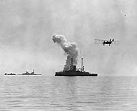 Photo #: 80-G-424471 Ex-USS Alabama (BB-8) Serving as a bombing target in Chesapeake Bay, 27 September 1921. A U.S. Army Martin twin-engine bomber is flying in the right foreground. Wrecks in the distance are the old battleships San Marcos (furthest to the left) and Indiana, both of which had previously been used as targets. Official U.S. Navy Photograph, now in the collections of the National Archives. Online Image: 88KB; 740 x 620 pixels Reproductions of this image may also be available through the National Archives photographic reproduction system. |