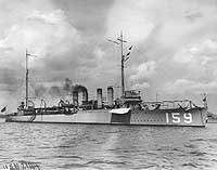 Photo #: NH 2212 USS Schenck (Destroyer # 159) At anchor, probably in Guantanamo Bay, Cuba in 1919-1920. Note the awning rigged out to shade her Wardroom and Captain's Cabin, and the short-range battle target between her two forward smokestacks. Collection of Gustave Maurer. U.S. Naval History and Heritage Command Photograph. Online Image: 92 KB; 900 x 730 pixels |