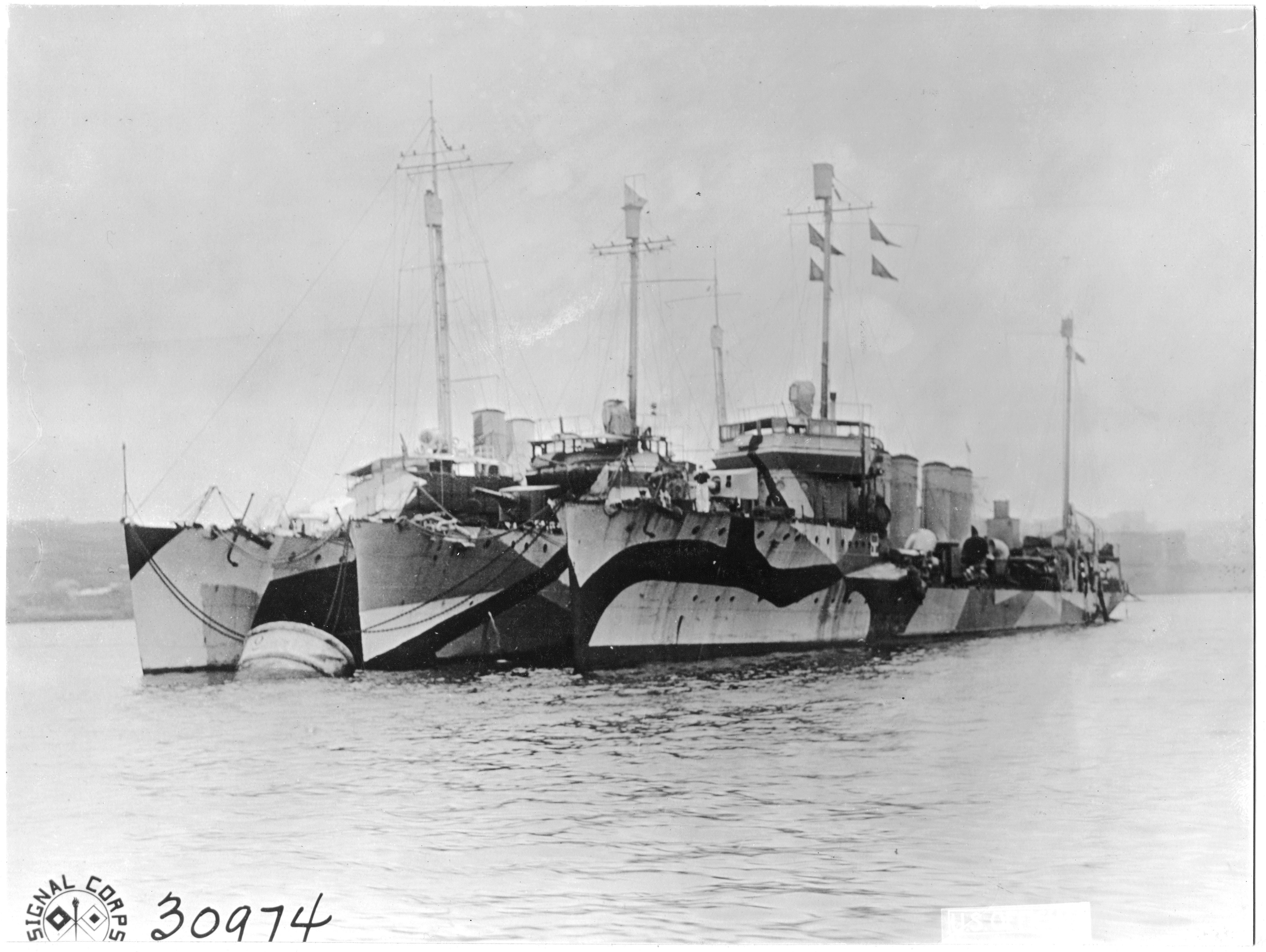 Photo #: NH 41513 USS Wainwright (Destroyer # 62), USS Winslow (Destroyer # 53), and USS Bell (Destroyer # 95) -- listed from right to left Moored to a bouy in the inner harbor of Brest, France on 27 October 1918. Note the various pattern camouflage designs worn by these three ships. U.S. Army Signal Corps Photograph, from the collections of the Naval History and Heritage Command. Online Image: 75 KB; 900 x 700 pixels |