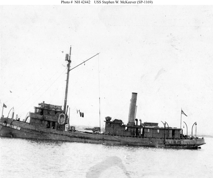 Photo #: NH 42442 USS Stephen W. McKeever Jr. (SP-1169) Photographed circa 1917-1919. Note the guns mounted amidships. Built in 1911 as a menhaden fishing boat, Stephen W. McKeever Jr. was acquired by the Navy on 4 August 1917 and placed in commission on the 14th. She was stricken from the list of Naval vessels on 27 March 1919 and sold on 1 June 1919. U.S. Naval History and Heritage Command Photograph. Online Image: 77 KB; 900 x 755 pixels |
