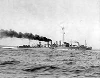 Steaming at high speed on two boilers, circa 1921, following conversion to a light minelayer. The Mine Force emblem is painted on her bow, and mines are resting on their tracks aft.