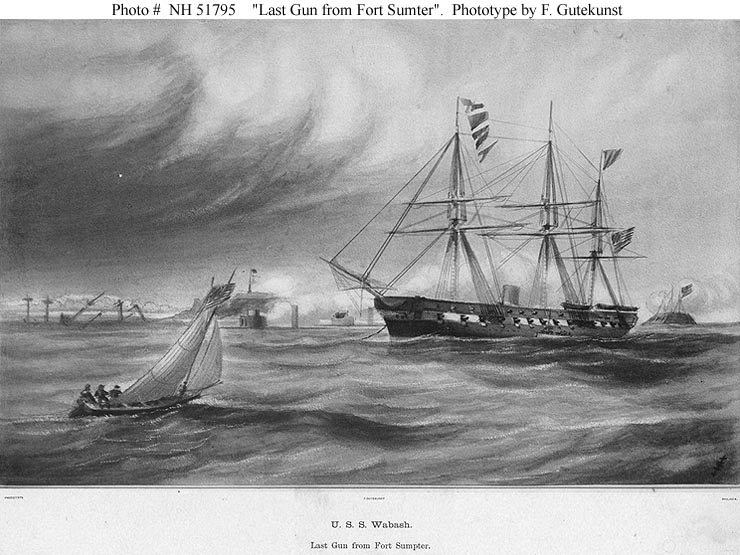 This print depicts a Civil War bombardment of Fort Sumter, in Charleston harbor, South Carolina, by U.S. Navy ships. USS Wabash is in the right foreground, with USS New Ironsides in the right distance. Two monitors are also present.