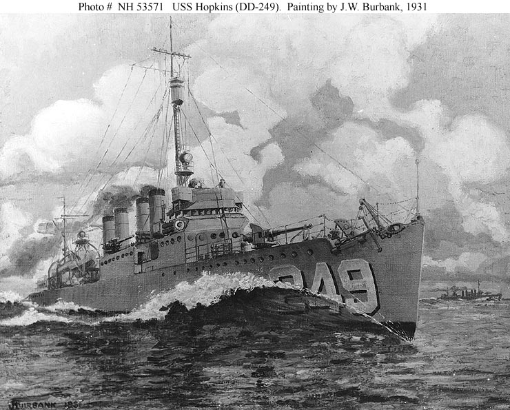Photo #: NH 53571 USS Hopkins (DD-249) Painting by J.W. Burbank, 1931. U.S. Naval Historical Center Photograph. Online Image: 125KB; 740 x 595 pixels |