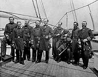 Photo #: NH 59429 Rear Admiral John A. Dahlgren, USN, Commanding the South Atlantic Blockading Squadron With other officers, possibly including members of his staff, on board USS Pawnee, in Charleston Harbor, South Carolina, circa 1864-1865. In addition to Dahlgren, three Captains, two Lieutenant Commanders, a Lieutenant and two Ensigns are present. U.S. Naval Historical Center Photograph. Online Image: 132KB; 740 x 610 pixels A stereo pair version of this image is available as Photo # NH 59429-A Online Image of stereo pair: 85KB; 675 x 350 pixels |