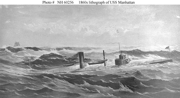 Photo #: NH 60256 USS Manhattan (1864-1902) Lithograph published during the 1860s, depicting the ship at sea. U.S. Naval Historical Center Photograph. Online Image: 74KB; 740 x 405 pixels |