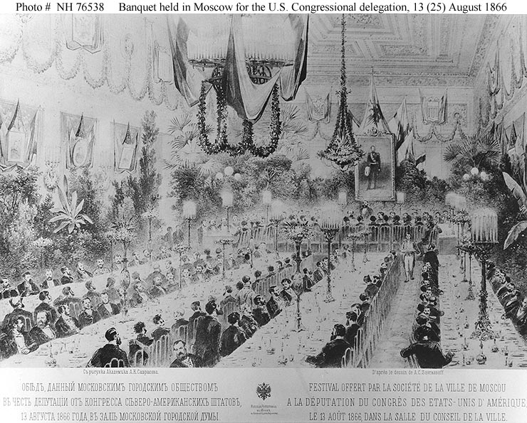 Photo #: NH 76538 Banquet in Moscow, Russia, 13 (25) August 1866 Given by the Society of the City of Moscow. Prince Sherbatoff is shown speaking, in front of a portrait of Czar Alexander II, with Assistant Secretary of the Navy Gustavus V. Fox seated on his right. Print, after a design by A.C. Savrassoff, published in Moscow, circa 1866. It was presented to Mr. Fox on 3 April 1868 by Jeremiah Curtin, who was Secretary of the American Legation in Russia in 1866. The inscription below the print states that the banquet was given for a delegation of the Congress of the United States. Photo # NH 76539 and Photo # NH 76540 are views of labels affixed to the original print. U.S. Naval Historical Center Photograph. Online Image: 162KB; 740 x 595 pixels |