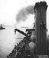 of the Pacific Fleet's Second Squadron) and a ferryboat are in