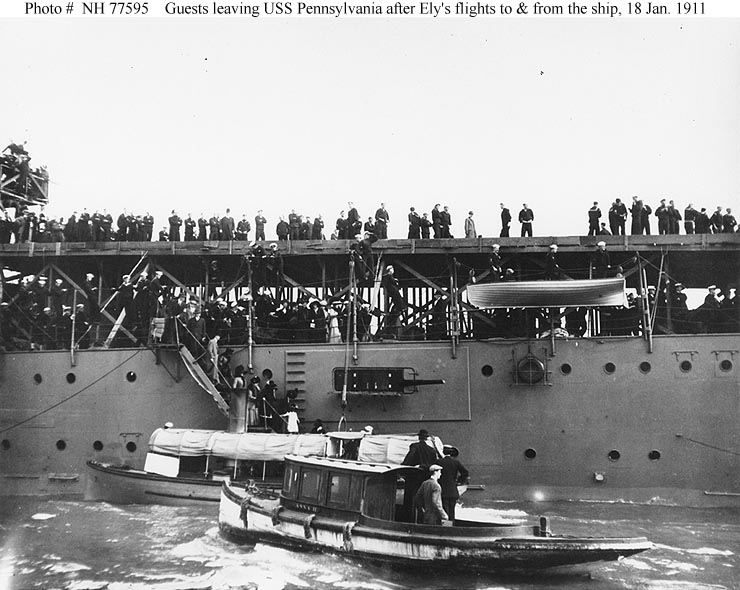 Guests leaving the ship after witnessing aviator Eugene B. Ely's