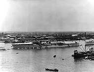 Photo #: NH 81987 Lamotte-Picquet (French Light Cruiser, 1926) Moored off Shanghai, China, probably in late May or early June 1939. At left is the stern of the British light cruiser Birmingham. Bow of USS Chaumont (AP-5) is at right, immediately astern of Lamotte-Picquet. Also present are the Danish steamer Promise (beyond Lamotte-Picquet's bow), British steamer Yingchow (right background) and the British steamer Shantung (partially visible in the right foreground). This image forms a panorama with Photo #s NH 81985, NH 81986 and NH 81988. Collection of Admiral Harry E. Yarnell, 1975. U.S. Naval Historical Center Photograph. Online Image: 73KB; 690 x 555 pixels |